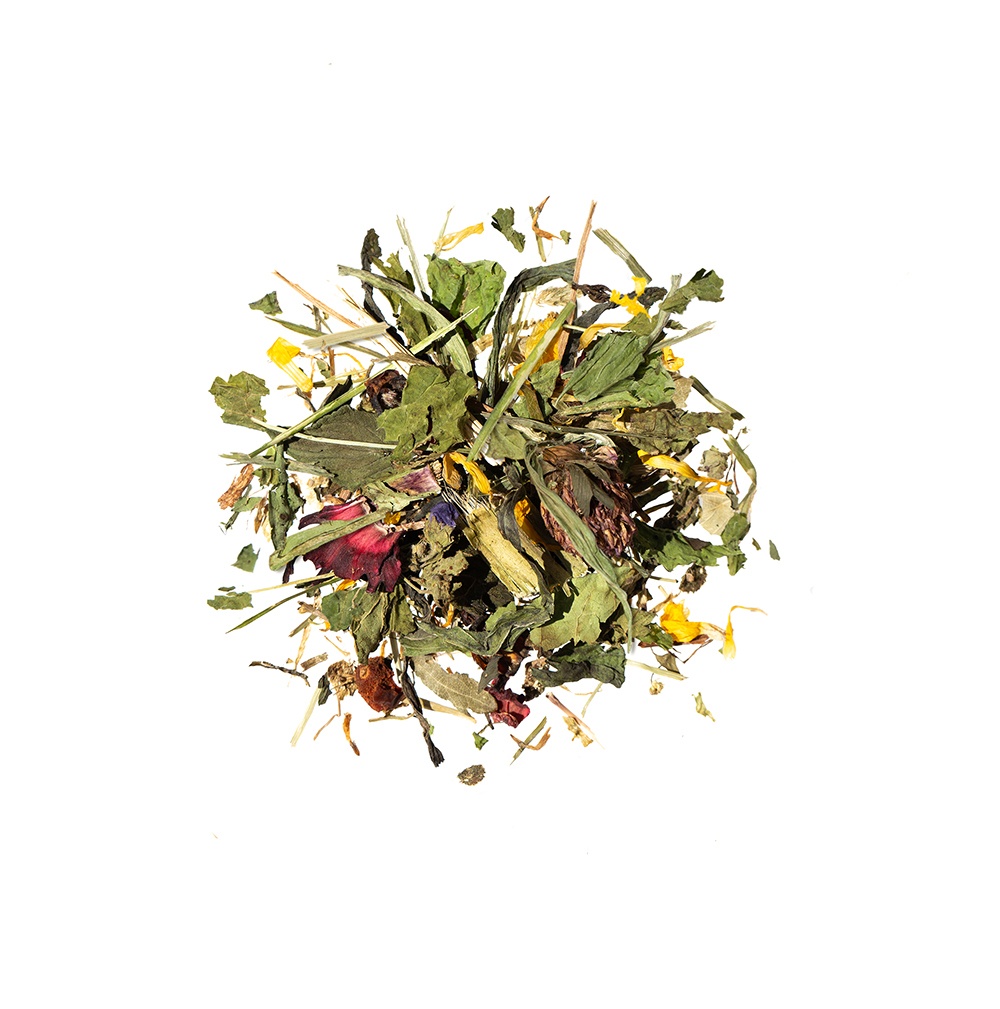 Wiesengräser und -kräuter (warmluftgetrocknet, gehäckselt), Spitzwegerichblätter (getrocknet), Löwenzahnblätter (getrocknet), Erdbeerblätter (getrocknet), Pfefferminzblätter (getrocknet), Hagebutte (getrocknet), Hibiscusblüten (getrocknet), Brennnessel (getrocknet), Malvenblüten (getrocknet), Himbeerblätter (getrocknet), Rotkleeblüten (getrocknet), Ringelblumenblüten (getrocknet)